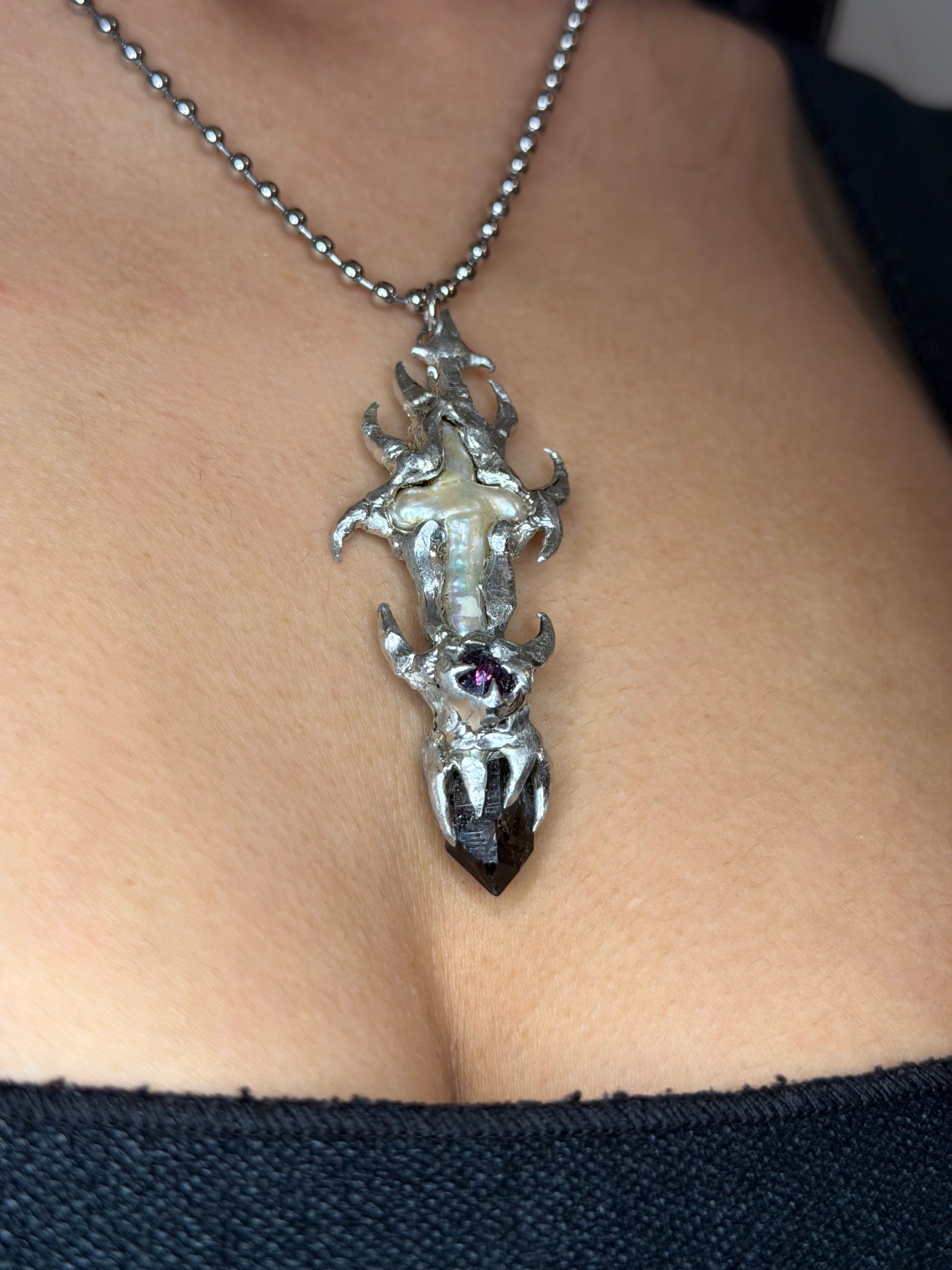 An eye-catching pendant featuring a cross shaped freshwater pearl and Swarovski crystal, ending in a beautiful smoky quartz semi precious stone, all combined with the use of lead free solder. All lead free solder parts are covered with a layer of polish to prevent oxidation and all other metal components are stainless steel.