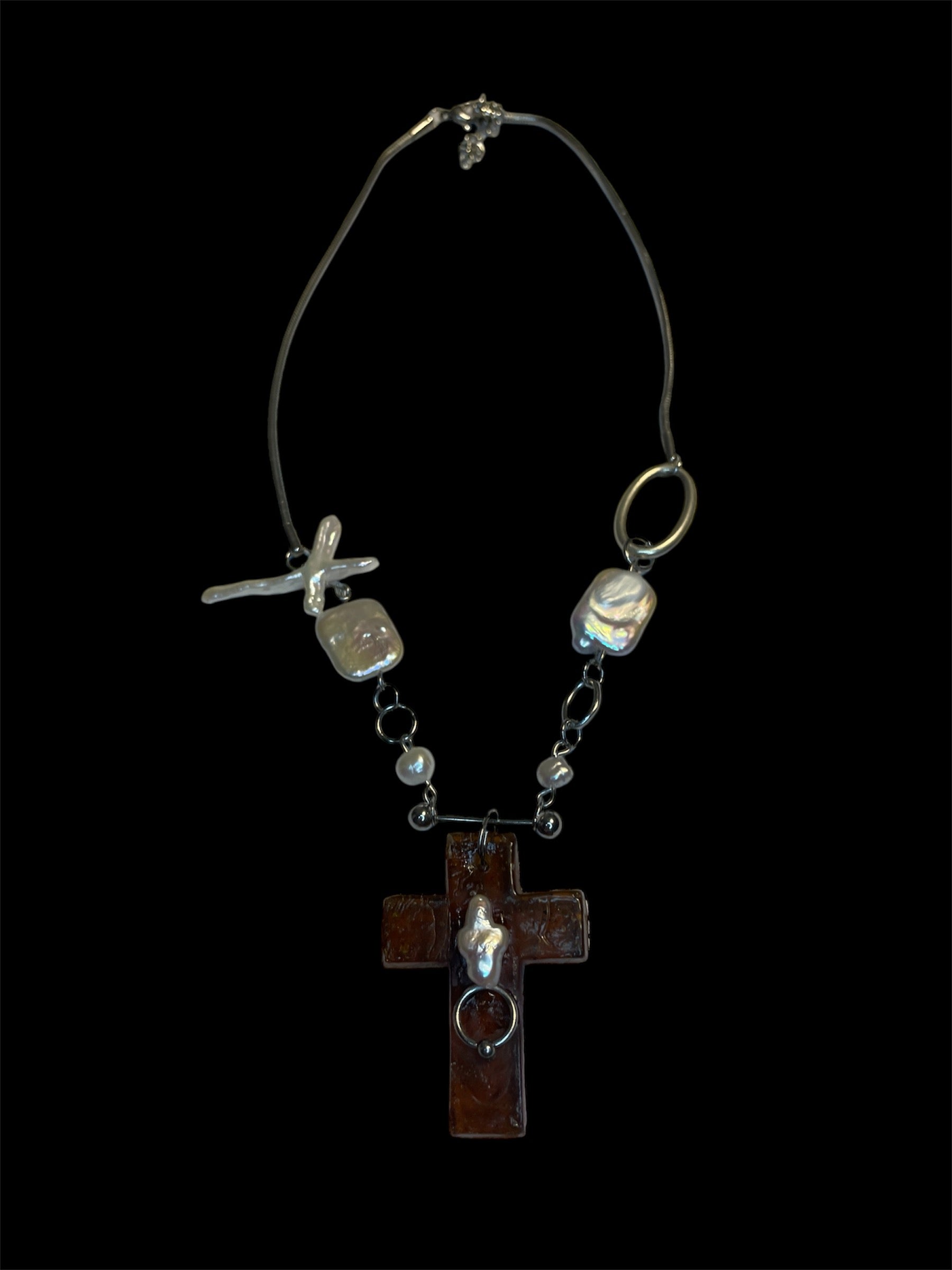 Materials: Thick glass cross, stainless steel and fresh water pearls