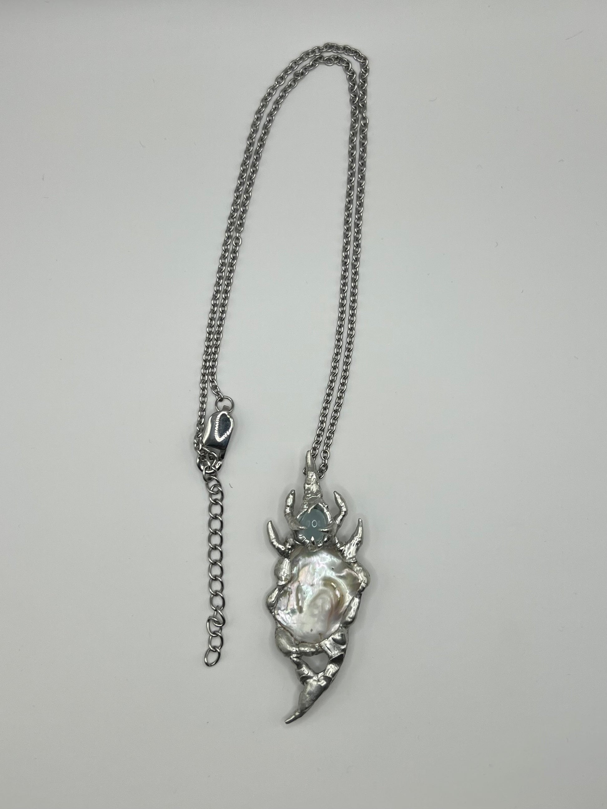 Beautiful elegant pendant featuring a freshwater pearl and an aqua marine stone. The chain is adjustable and stainless steel. Made to order.