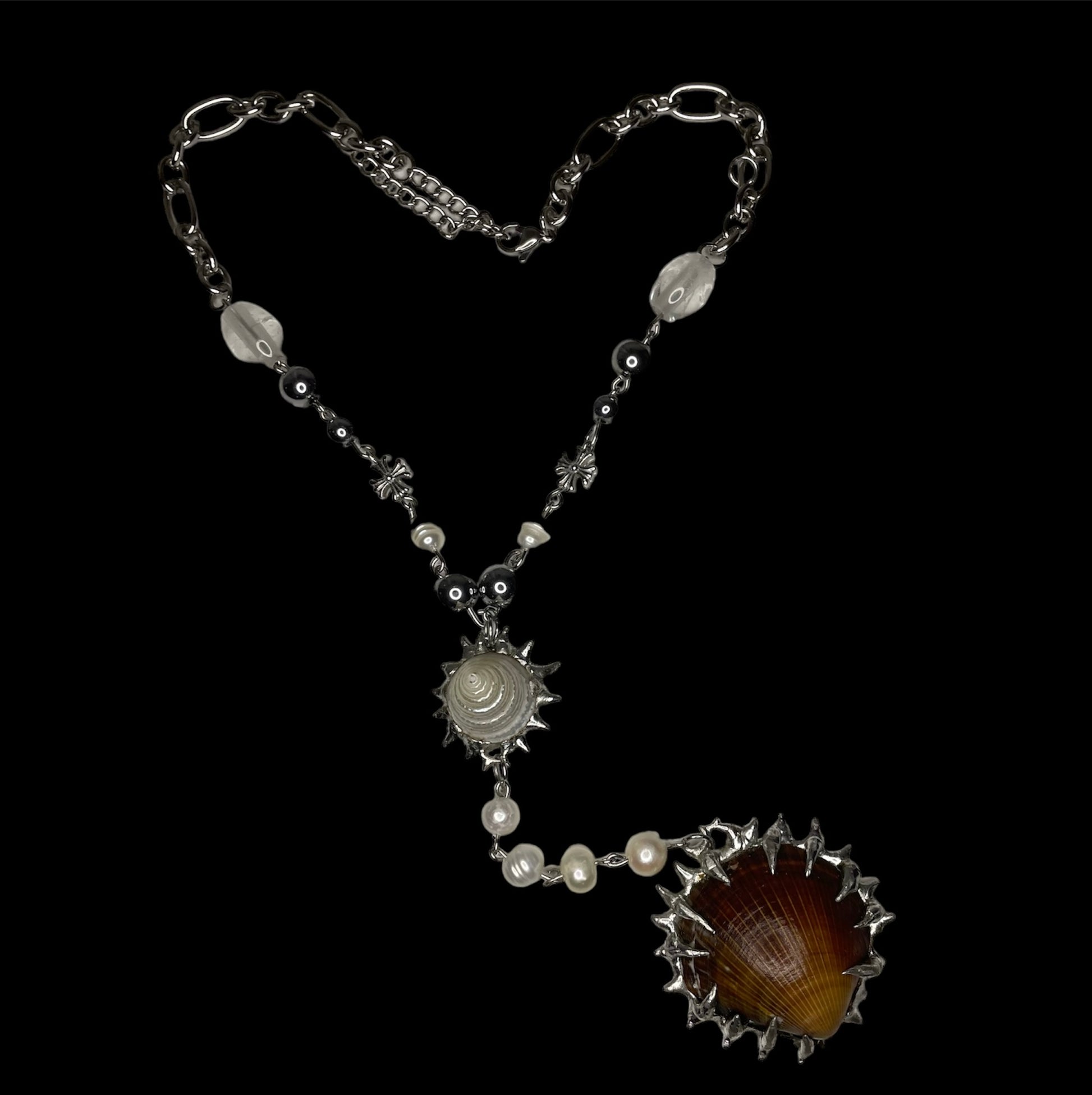 The seashell duality rosary is made with stainless steel chains, quartz beads, freshwater pearls and a handmade soldered seashell. It's a statement and unique piece made with a lot of love and care.
