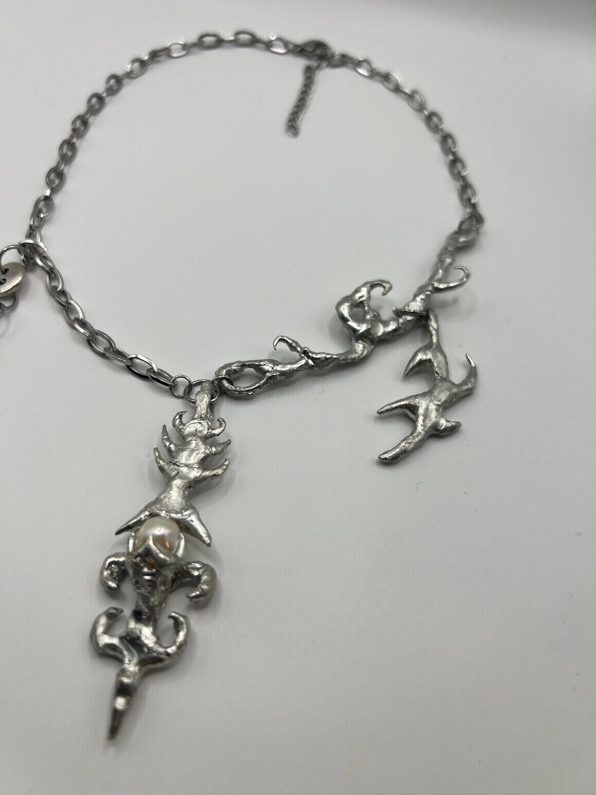 Statement Necklace with beautiful freshwater pearls, unique shapes made by using lead free solder ( 99,3 tin, 0,7 copper). All metal components are stainless steel except from the metallic buttons which are brass. All soldered pieces are coated with a layer of polish to prevent oxidation. Handmade with love and care